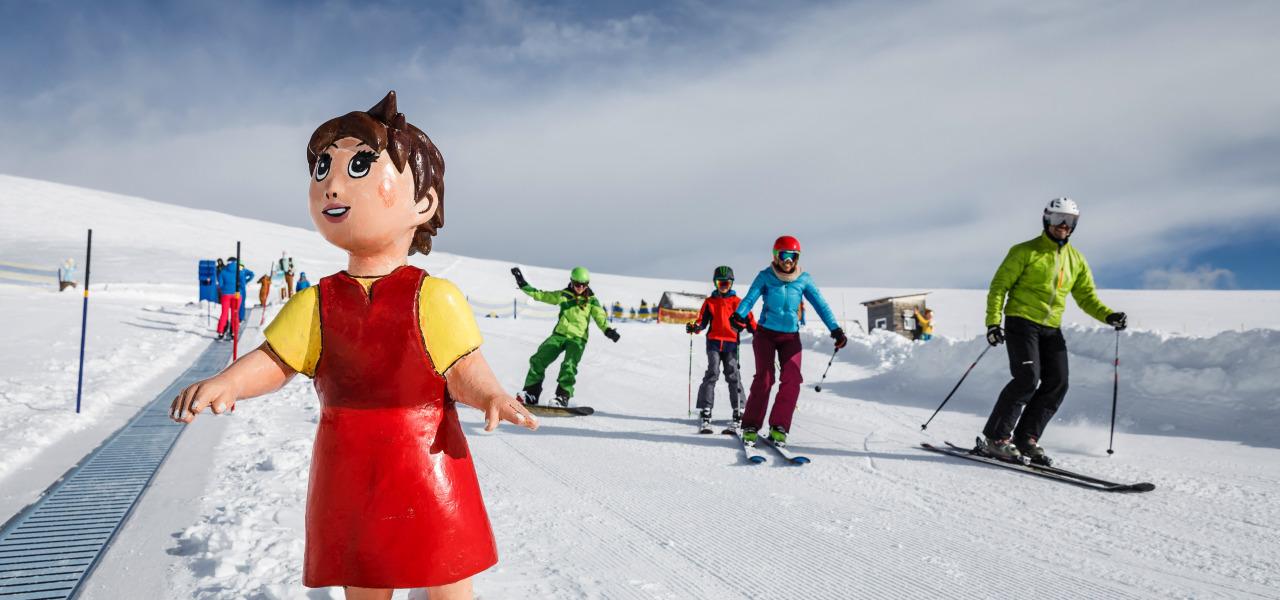 Die bekannten Figuren aus der Serie „Heidi“ versprechen einen spielerischen Weg um Skifahren zu lernen.