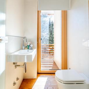 Ein Badezimmer mit Dusche und ein zusätzliches separates WC mit Waschbecken ausgestattete Küchenzeile runden das Angebot ab.