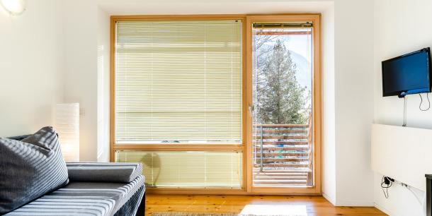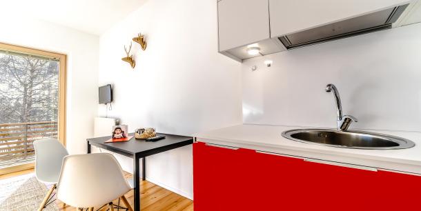 Auf 22 m² findet man eine voll ausgestattete Küchenzeile, sowie einen kleinen Ess- bzw. Wohnbereich mit ausziehbarem Schlafsofa (ein Raum).